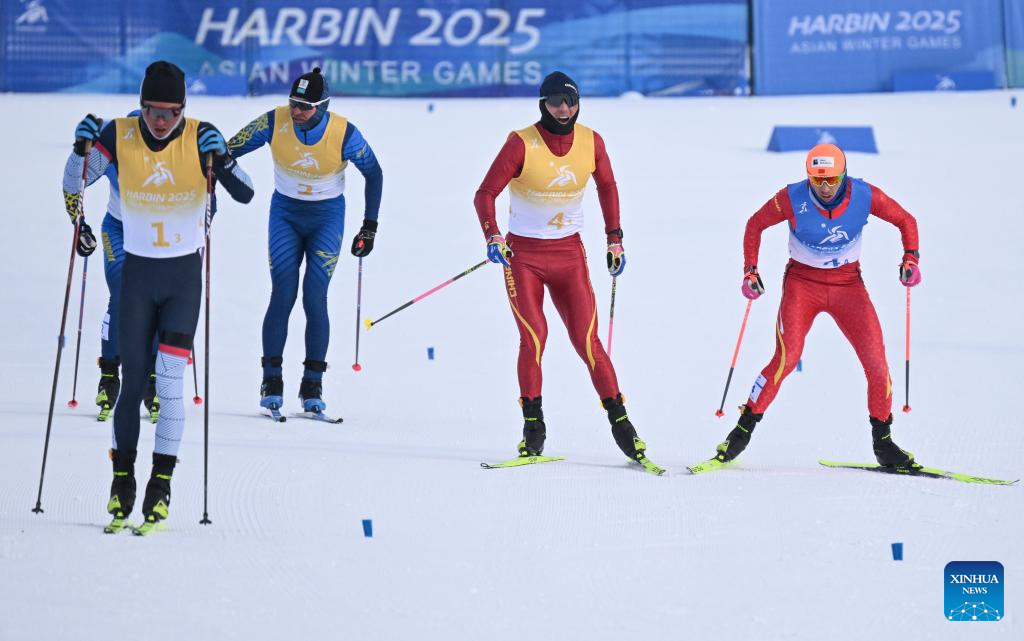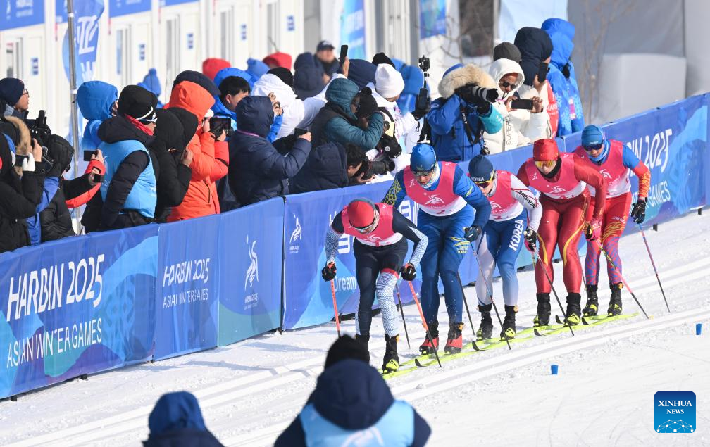 Li Minglin (1st R) of China competes during the Cross-Country Skiing men's 4x7.5km relay match at the 9th Asian Winter Games in Yabuli, northeast China's Heilongjiang Province, Feb. 12, 2025. (Xinhua/Wu Zhizun)