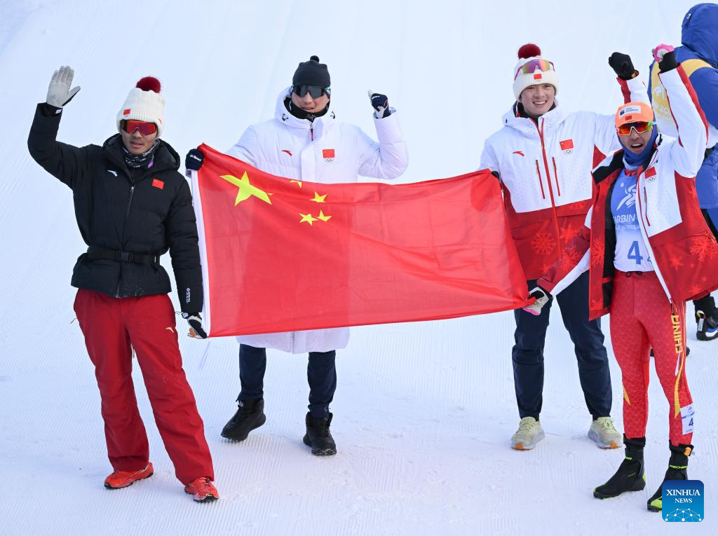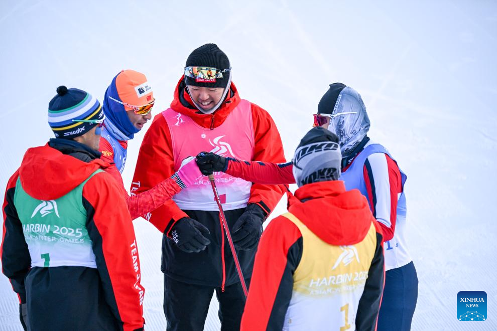 Team China celebrate after the Cross-Country Skiing men's 4x7.5km relay match at the 9th Asian Winter Games in Yabuli, northeast China's Heilongjiang Province, Feb. 12, 2025. (Xinhua/Lian Zhen)