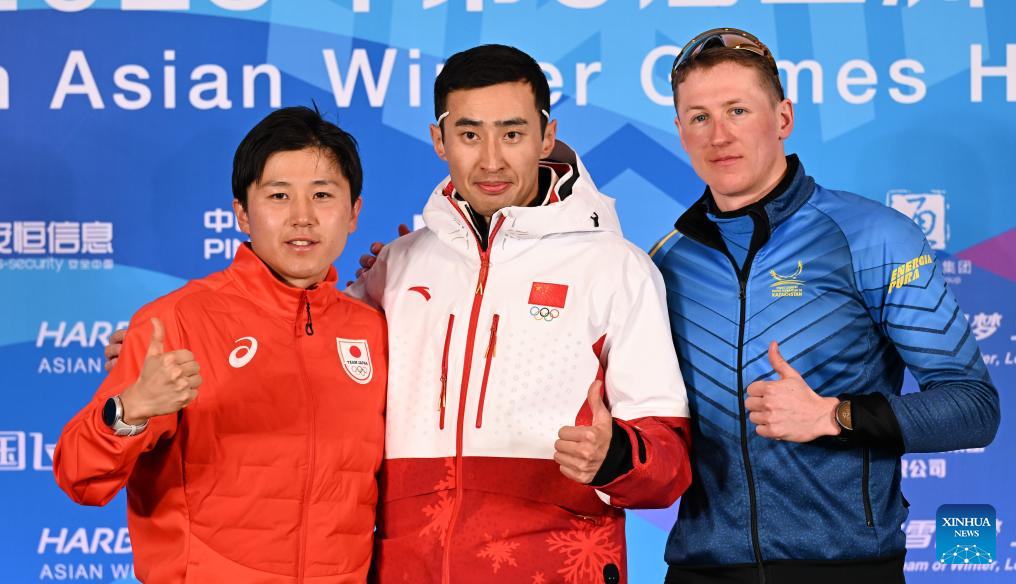 Gold medalist Wang Qiang (C) of China, silver medalist Yamashita Haruki (L) of Japan, and bronze medalist Vladislav Kovalyov of Kazakhstan pose during the press conference after the Cross-Country Skiing men's 4x7.5km relay match at the 9th Asian Winter Games in Yabuli, northeast China's Heilongjiang Province, Feb. 12, 2025. (Xinhua/Yang Guanyu)