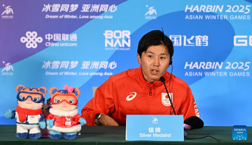 Silver medalist Yamashita Haruki of Japan attends the press conference after the Cross-Country Skiing men's 4x7.5km relay match at the 9th Asian Winter Games in Yabuli, northeast China's Heilongjiang Province, Feb. 12, 2025. (Xinhua/Yang Guanyu)