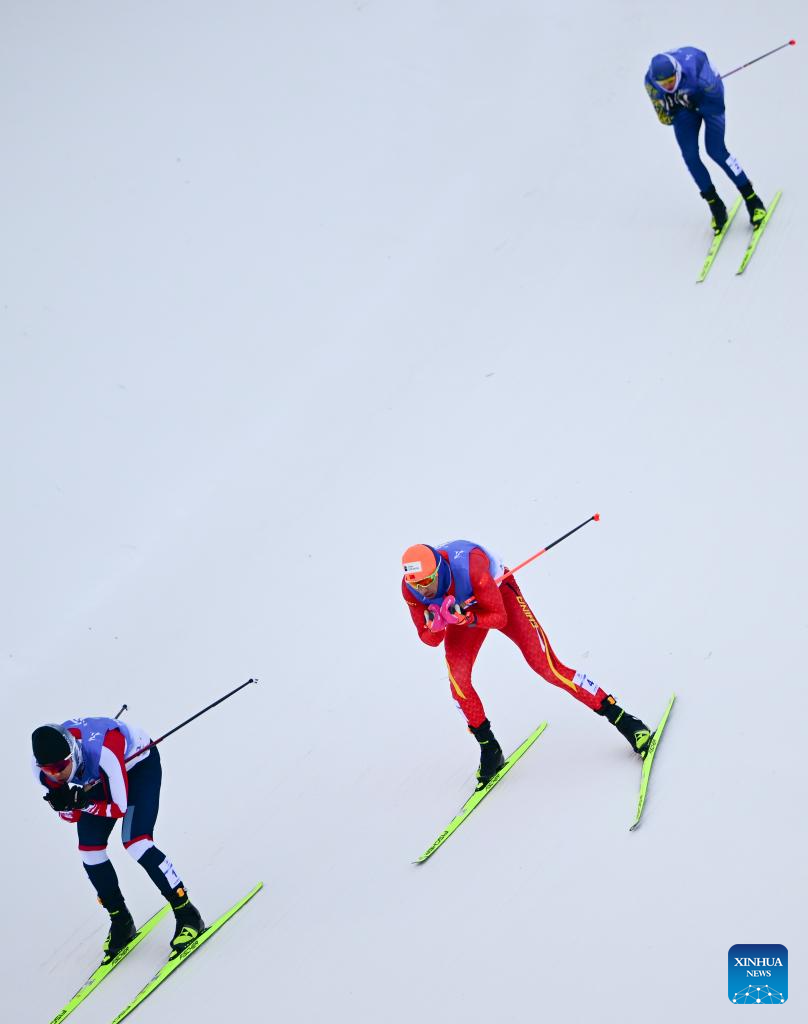 Wang Qiang (C) of China competes during the Cross-Country Skiing men's 4x7.5km relay match at the 9th Asian Winter Games in Yabuli, northeast China's Heilongjiang Province, Feb. 12, 2025. (Xinhua/Zhang Long)