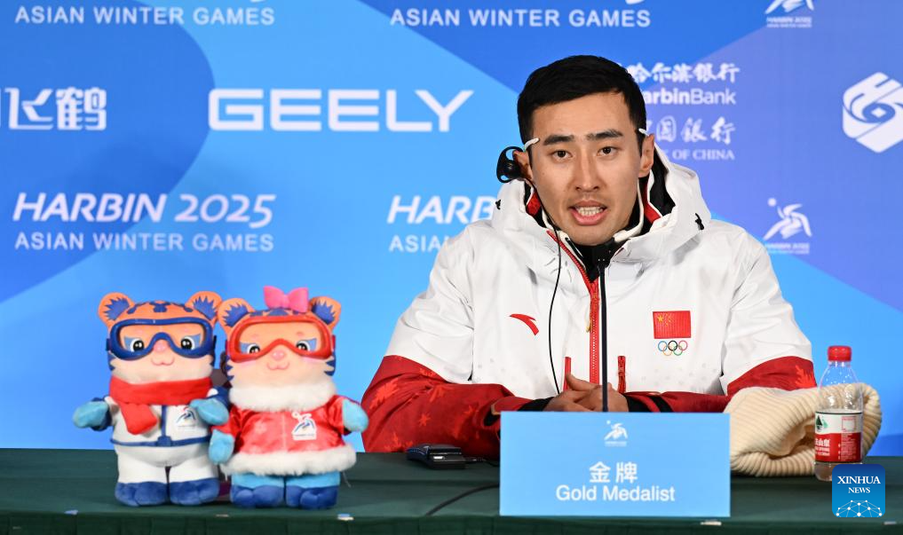 Gold medalist Wang Qiang of China attends the press conference after the Cross-Country Skiing men's 4x7.5km relay match at the 9th Asian Winter Games in Yabuli, northeast China's Heilongjiang Province, Feb. 12, 2025. (Xinhua/Yang Guanyu)
