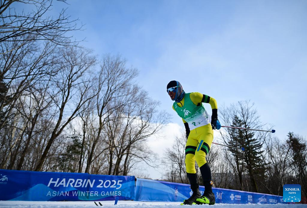 Aman Kumar of India competes during the Cross-Country Skiing men's 4x7.5km relay match at the 9th Asian Winter Games in Yabuli, northeast China's Heilongjiang Province, Feb. 12, 2025. (Xinhua/Zhang Long)