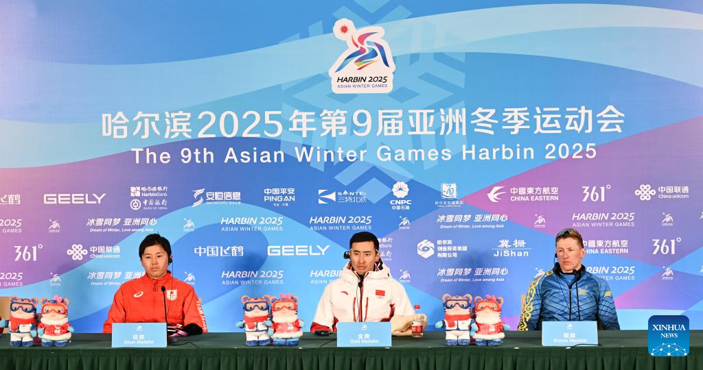 Gold medalist Wang Qiang (C) of China, silver medalist Yamashita Haruki (L) of Japan, and bronze medalist Vladislav Kovalyov of Kazakhstan attend the press conference after the Cross-Country Skiing men's 4x7.5km relay match at the 9th Asian Winter Games in Yabuli, northeast China's Heilongjiang Province, Feb. 12, 2025. (Xinhua/Yang Guanyu)