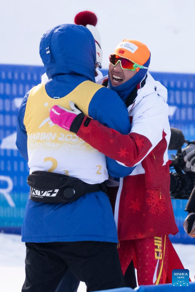 Wang Qiang (R) of China celebrates with Olzhas Klimin (L) of Kazakhstan after the Cross-Country Skiing men's 4x7.5km relay match at the 9th Asian Winter Games in Yabuli, northeast China's Heilongjiang Province, Feb. 12, 2025. (Xinhua/Wu Zhizun)