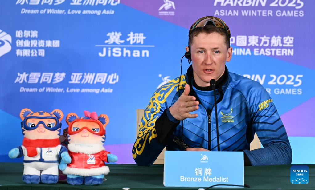 Bronze medalist Vladislav Kovalyov of Kazakhstan attends the press conference after the Cross-Country Skiing men's 4x7.5km relay match at the 9th Asian Winter Games in Yabuli, northeast China's Heilongjiang Province, Feb. 12, 2025. (Xinhua/Yang Guanyu)