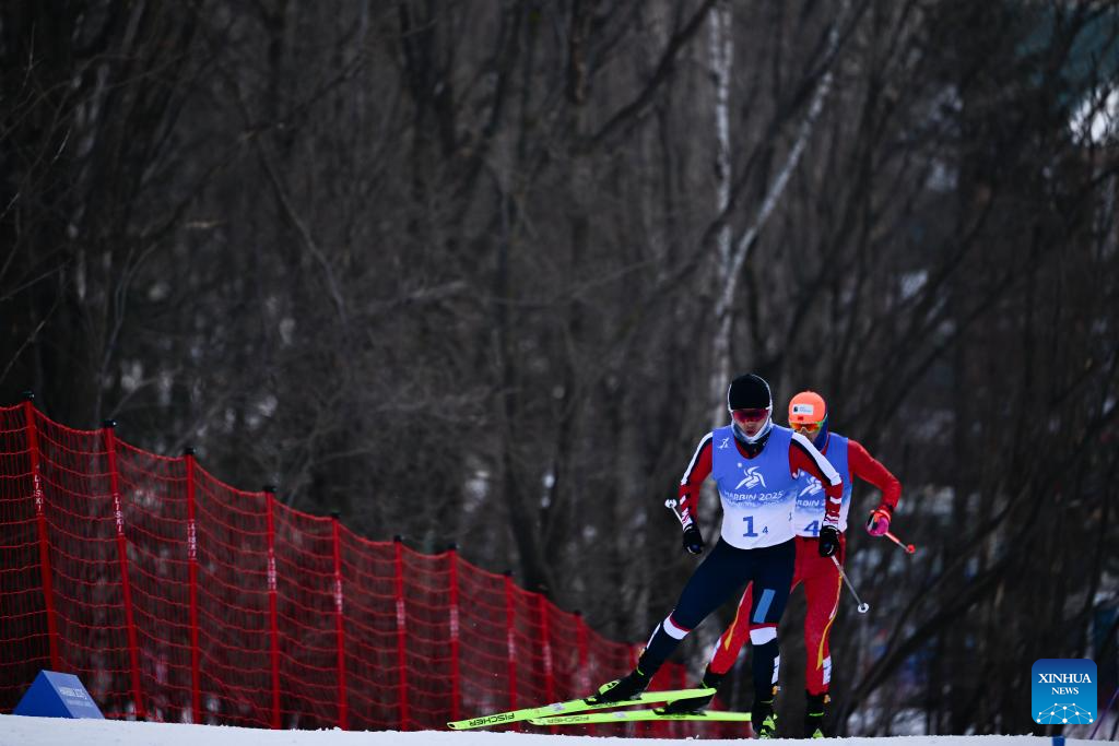 Li Minglin (L) of China competes during the Cross-Country Skiing men's 4x7.5km relay match at the 9th Asian Winter Games in Yabuli, northeast China's Heilongjiang Province, Feb. 12, 2025. (Xinhua/Wu Zhizun)