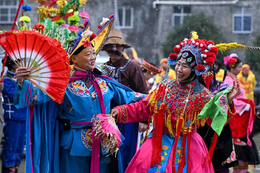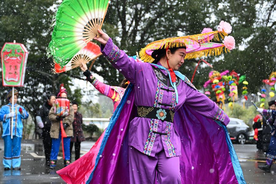 Folk artists of Lichuan Dengge perform on the street in Baiyangba Town, Lichuan City, Enshi Tujia and Miao Autonomous Prefecture, central China's Hubei Province, Feb. 6, 2025. (Xinhua/Du Zixuan)