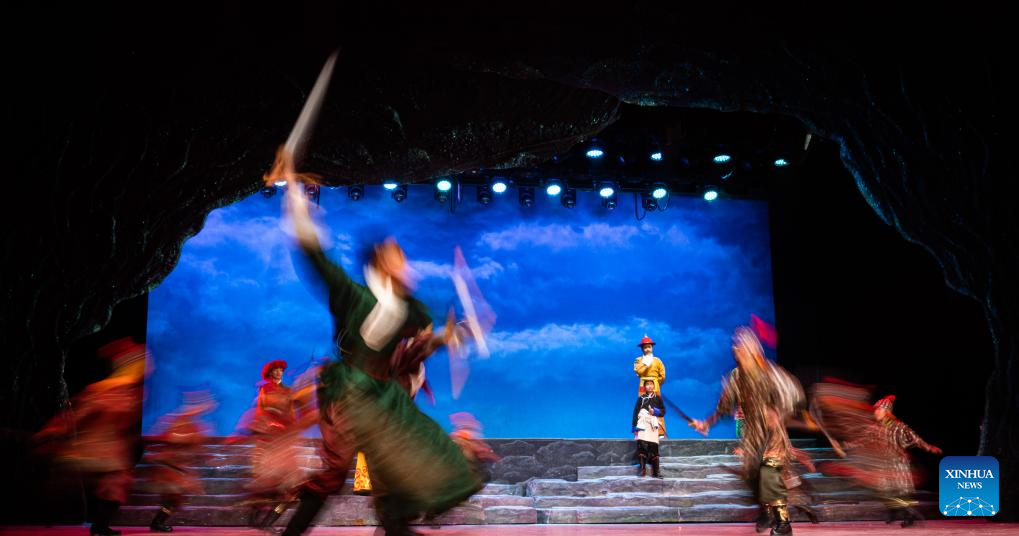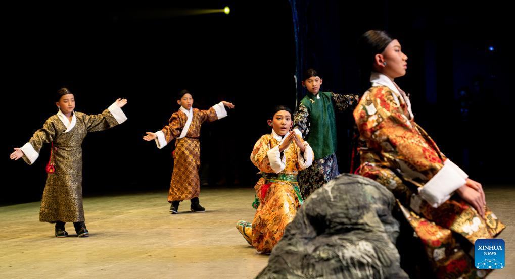 Young actors participate in a children's stage play at Tibetan Opera Art Center in Lhasa, southwest China's Xizang Autonomous Region, Feb. 11, 2025. Xizang's first children's stage play of Tibetan opera, a Tibetan art form that has a history of over 600 years, was staged at Tibetan Opera Art Center in Lhasa on Tuesday. A total of forty-four young actors participated in the performance, with the youngest only 5 years old. (Xinhua/Tenzin Nyida)