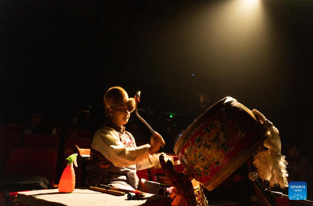 A young actor beats the drum and gong to accompany a children's stage play at Tibetan Opera Art Center in Lhasa, southwest China's Xizang Autonomous Region, Feb. 11, 2025. Xizang's first children's stage play of Tibetan opera, a Tibetan art form that has a history of over 600 years, was staged at Tibetan Opera Art Center in Lhasa on Tuesday. A total of forty-four young actors participated in the performance, with the youngest only 5 years old. (Xinhua/Tenzin Nyida)