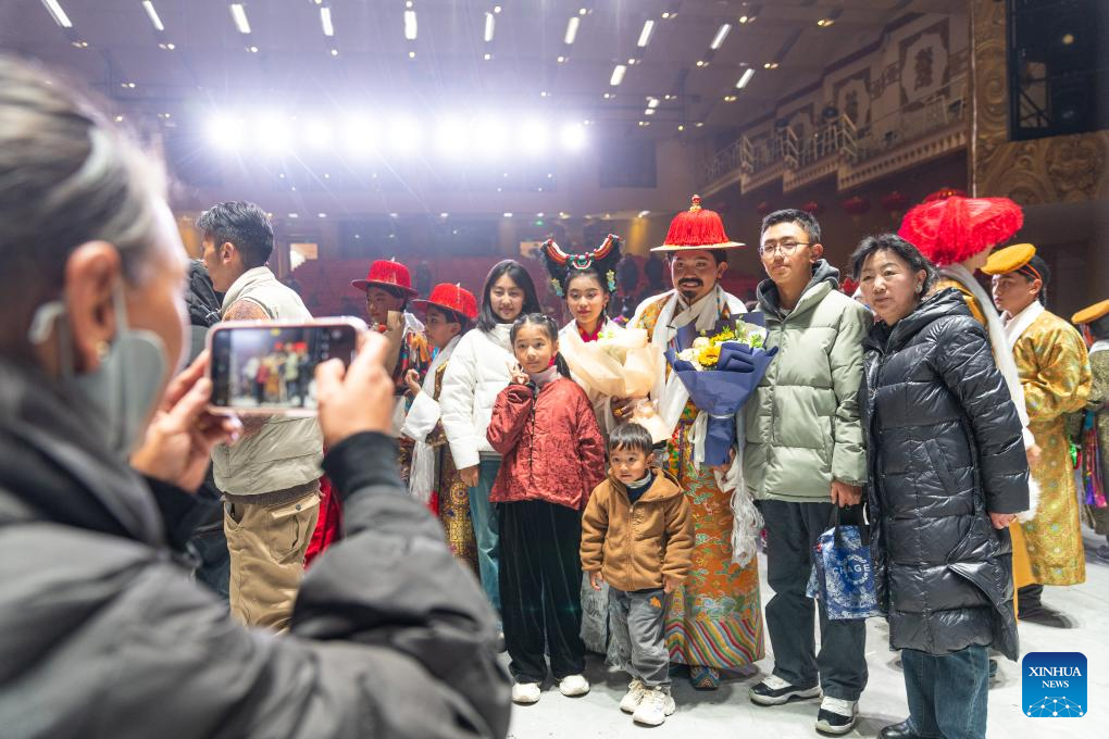 Young actors pose for a group photo with their families after a children's stage play at Tibetan Opera Art Center in Lhasa, southwest China's Xizang Autonomous Region, Feb. 11, 2025. Xizang's first children's stage play of Tibetan opera, a Tibetan art form that has a history of over 600 years, was staged at Tibetan Opera Art Center in Lhasa on Tuesday. A total of forty-four young actors participated in the performance, with the youngest only 5 years old. (Xinhua/Tenzin Nyida)