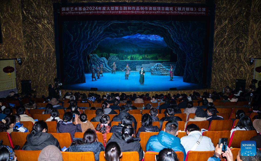 The audience applaud the performance of the young actors of a children's stage play at Tibetan Opera Art Center in Lhasa, southwest China's Xizang Autonomous Region, Feb. 11, 2025. Xizang's first children's stage play of Tibetan opera, a Tibetan art form that has a history of over 600 years, was staged at Tibetan Opera Art Center in Lhasa on Tuesday. A total of forty-four young actors participated in the performance, with the youngest only 5 years old. (Xinhua/Tenzin Nyida)