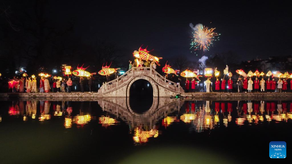 A fish-shaped lantern performance team parades at Hongcun Village, Huangshan City of east China's Anhui Province, Feb. 11, 2025. (Photo by Fan Chengzhu/Xinhua)