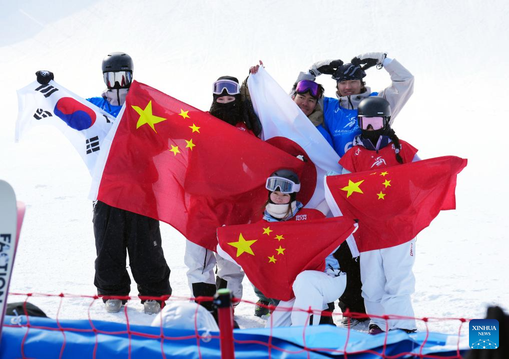 (from L to R) Yoon Jong Hyun of South Korea, Liu Mengting of China, Yang Ruyi of China, Kasamura Rai of Japan, Shin Yeongseop of South Korea and Han Linshan of China celebrate after the Freestyle Skiing men's freeski big air final match at the 9th Asian Winter Games in Yabuli, northeast China's Heilongjiang Province, Feb. 12, 2025. (Xinhua/Wang Song)