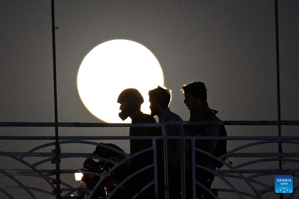 People pass a bridge as a full moon is seen over Islamabad, Pakistan, on Feb. 12, 2025. (Xinhua/Ahmad Kamal)