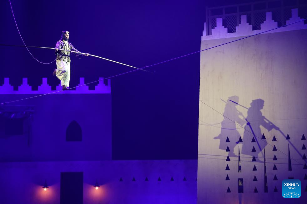 An acrobat performs during the "Souk Wonders" immersive show in Riyadh, Saudi Arabia, Feb. 11, 2025. The show was part of the artistic and entertainment programs of the country's Diriyah Season 24/25. (Xinhua/Wang Haizhou)