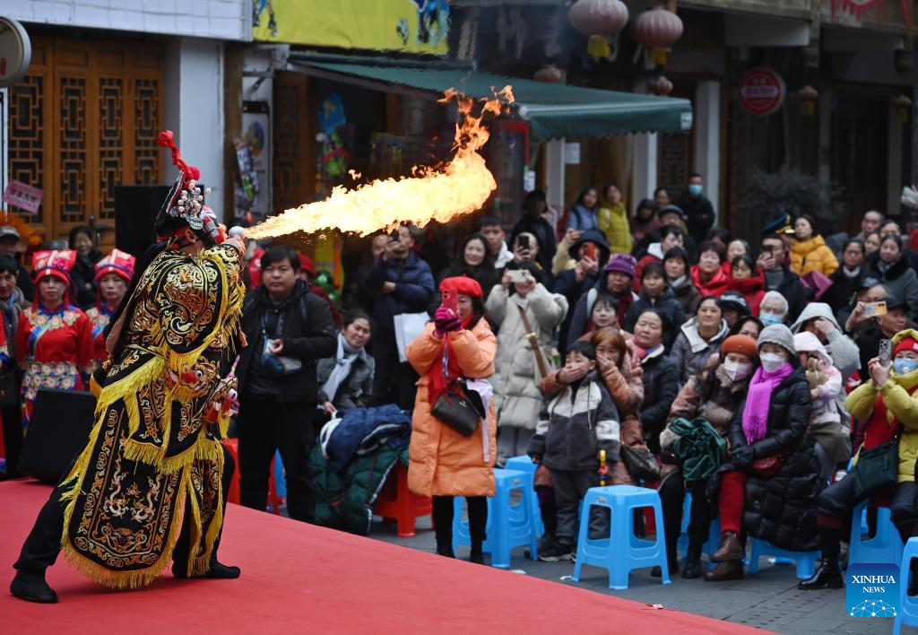People watch a performance of Bianlian, or face-changing, a part of the Sichuan opera, in Dongxing District of Neijiang City, southwest China's Sichuan Province, Feb. 12, 2025. (Photo by Tang Mingrun/Xinhua)