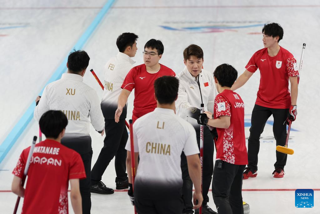 Athletes shake hands after the curling men's round robin group B session 13 match between Japan and China at the 9th Asian Winter Games in Harbin, northeast China's Heilongjiang Province, Feb. 12, 2025. (Xinhua/Hu Xingyu)