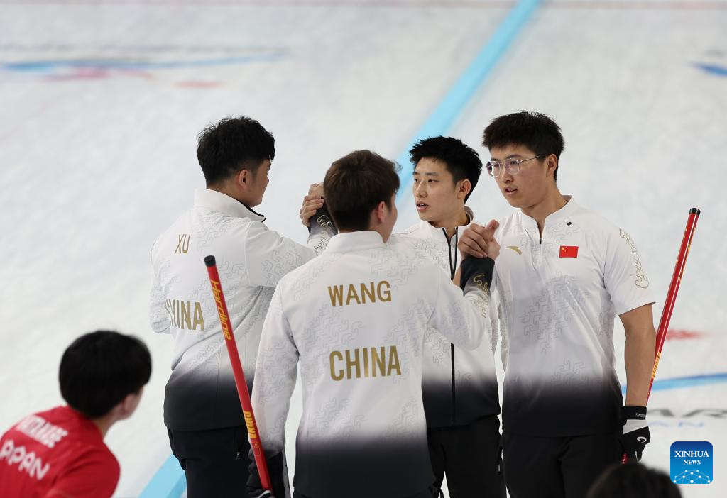 Xu Xiaoming, Wang Zhiyu, Fei Xueqing and Li Zhichao (L to R) of China celebrate after the curling men's round robin group B session 13 match between Japan and China at the 9th Asian Winter Games in Harbin, northeast China's Heilongjiang Province, Feb. 12, 2025. (Xinhua/Hu Xingyu)