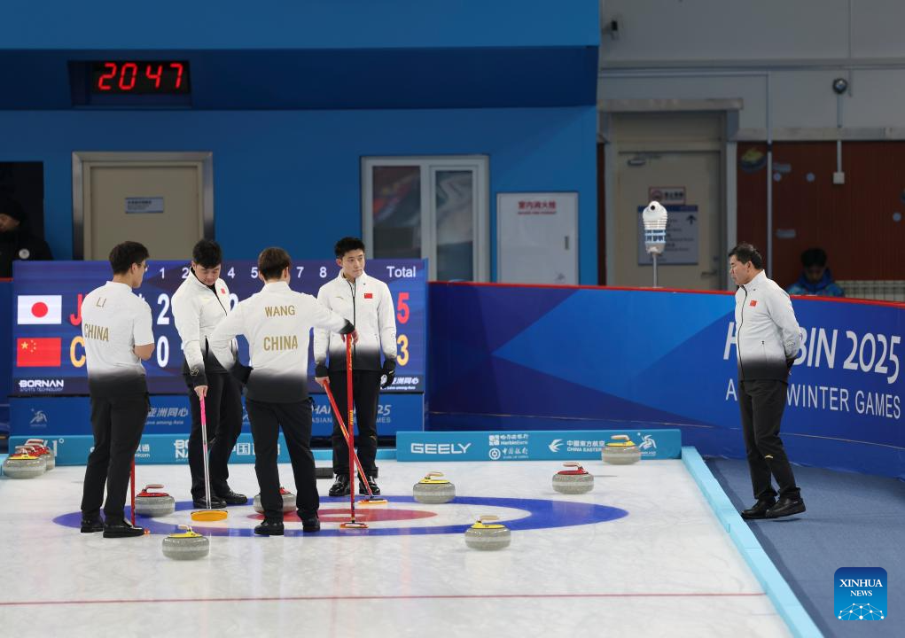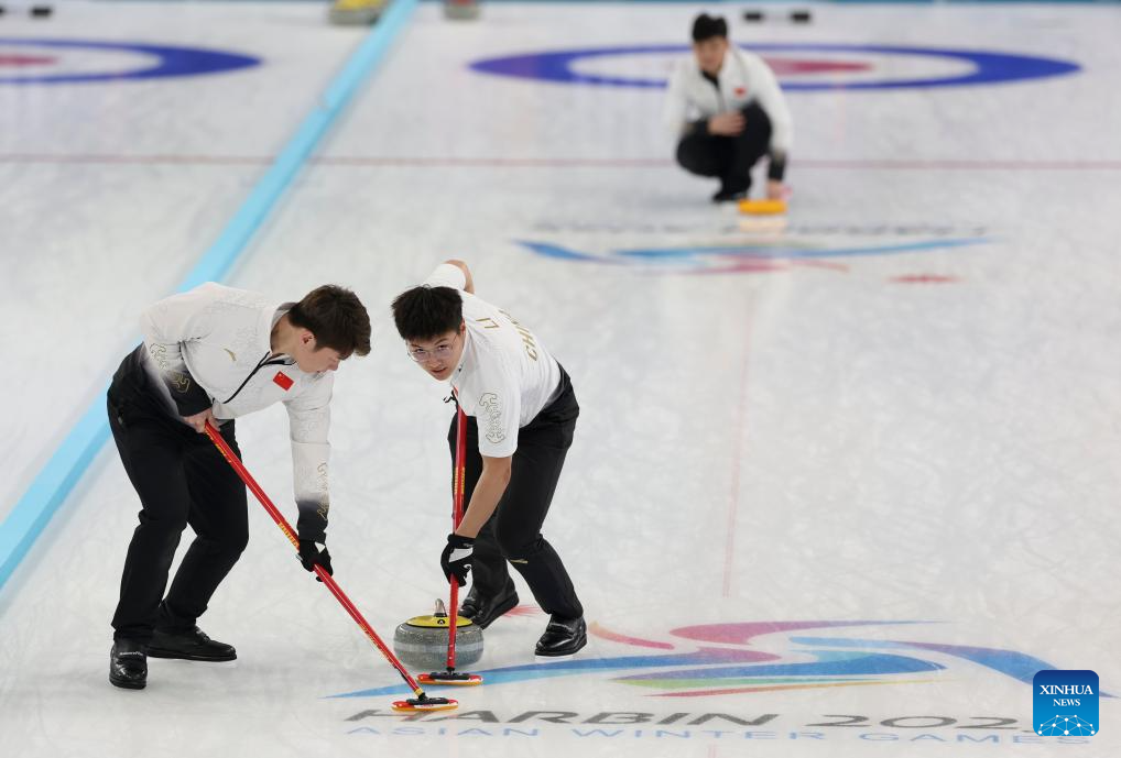 Wang Zhiyu (L) and Li Zhichao (C) of China compete during the curling men's round robin group B session 13 match between Japan and China at the 9th Asian Winter Games in Harbin, northeast China's Heilongjiang Province, Feb. 12, 2025. (Xinhua/Hu Xingyu)