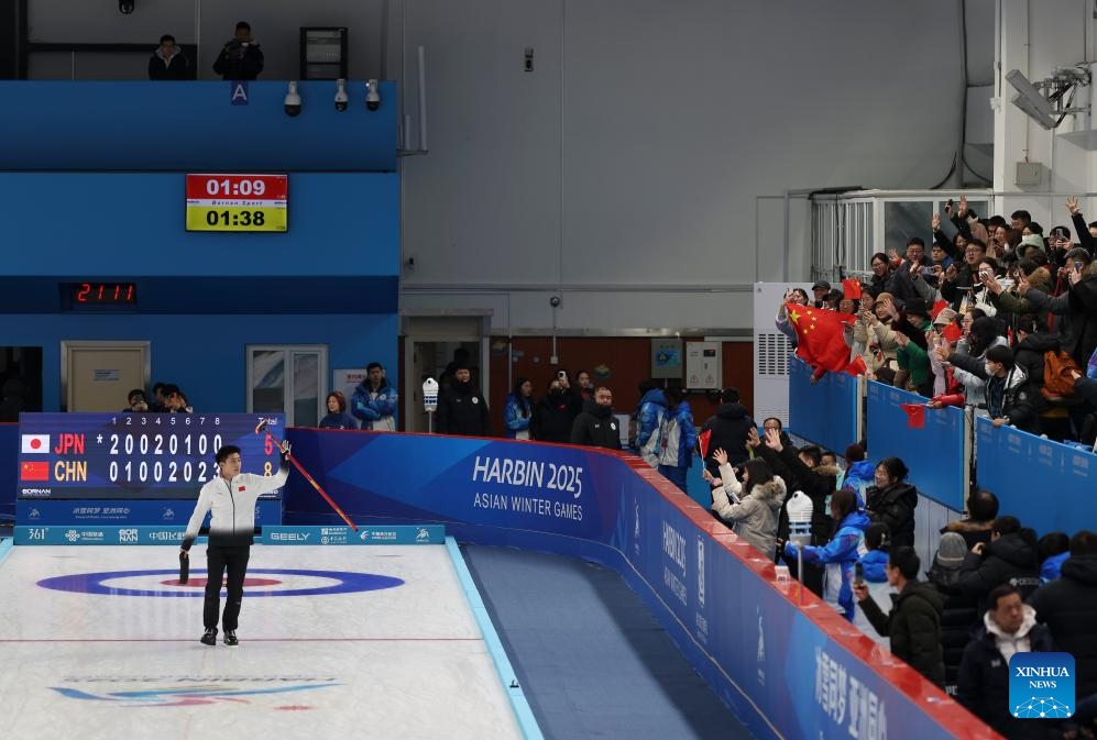 Fei Xueqing (L) of China greet the spectators after the curling men's round robin group B session 13 match between Japan and China at the 9th Asian Winter Games in Harbin, northeast China's Heilongjiang Province, Feb. 12, 2025. (Xinhua/Hu Xingyu)