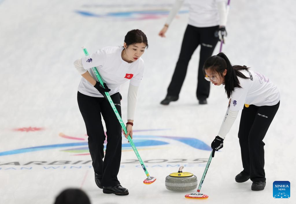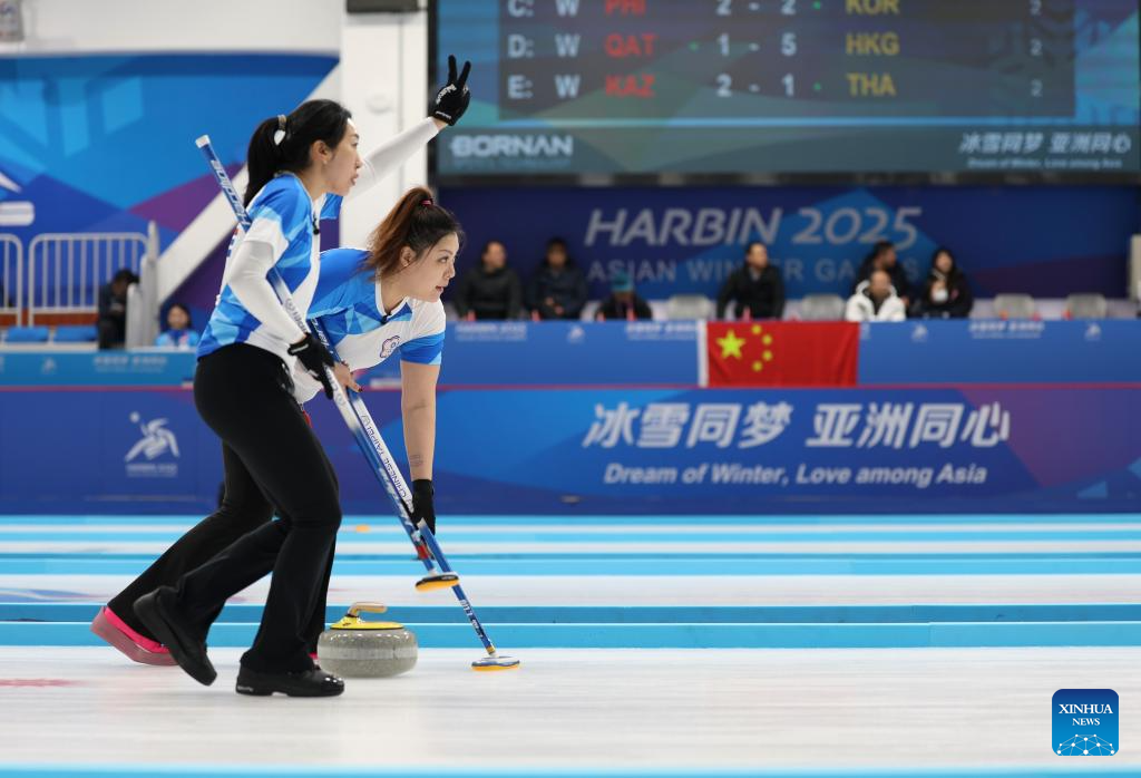 Hu Pianpian (L) and Chan Ka of China's Hong Kong compete during the curling women's round robin session 13 match between Qatar and China's Hong Kong at the 9th Asian Winter Games in Harbin, northeast China's Heilongjiang Province, Feb. 12, 2025. (Xinhua/Hu Xingyu)