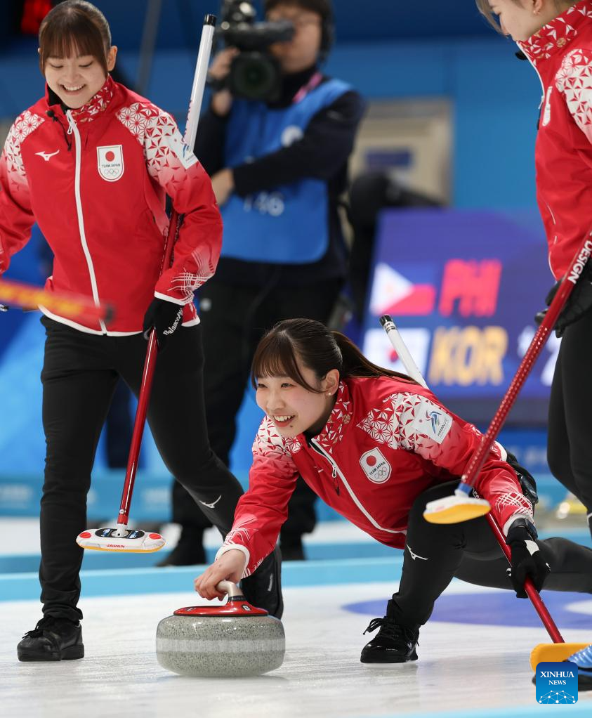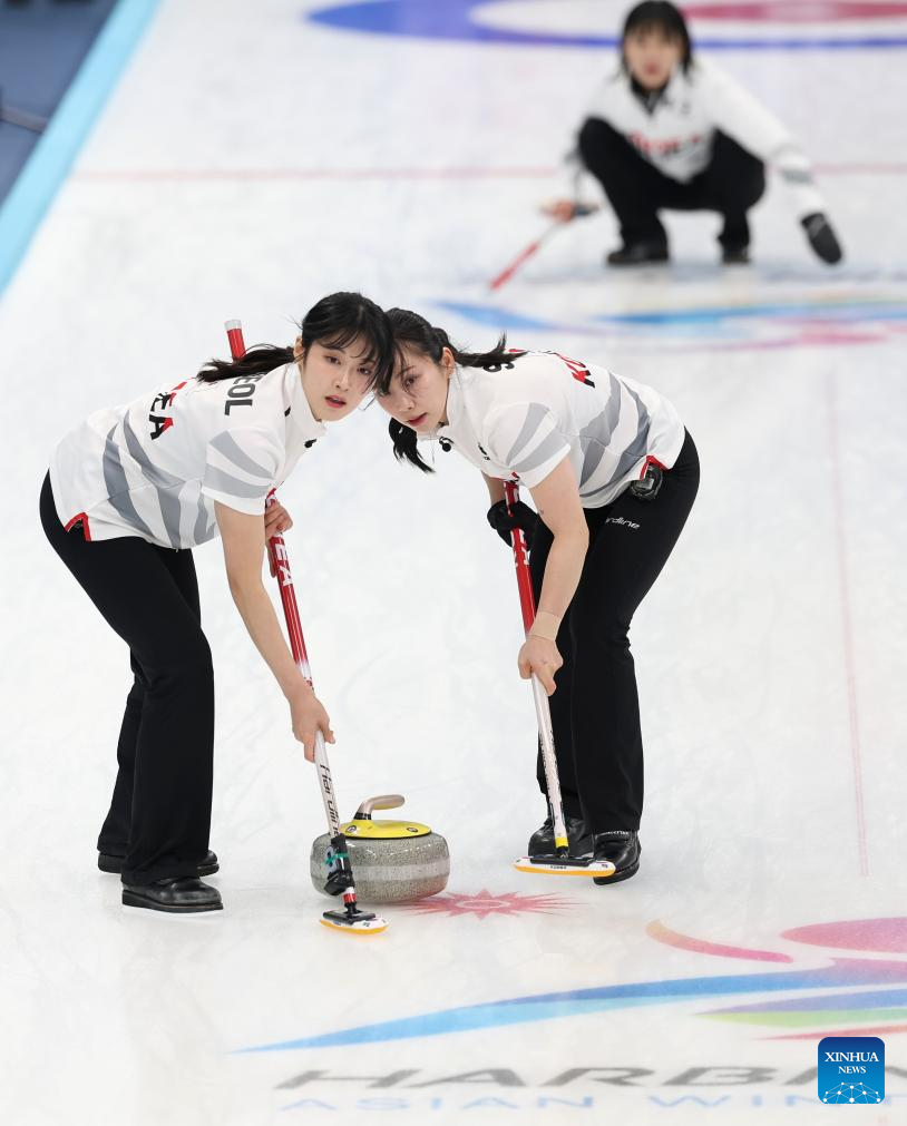 Ikeda Hana (R, front) of Japan competes during the curling women's round robin session 13 match between Japan and Chinese Taipei at the 9th Asian Winter Games in Harbin, northeast China's Heilongjiang Province, Feb. 12, 2025. (Xinhua/Hu Xingyu)
