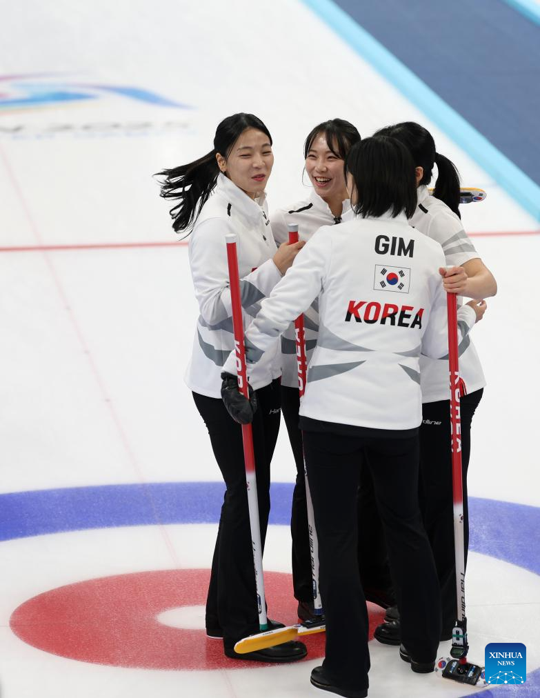 Athletes of South Korea celebrate after the curling women's round robin session 13 match between the Philippines and South Korea at the 9th Asian Winter Games in Harbin, northeast China's Heilongjiang Province, Feb. 12, 2025. (Xinhua/Hu Xingyu)
