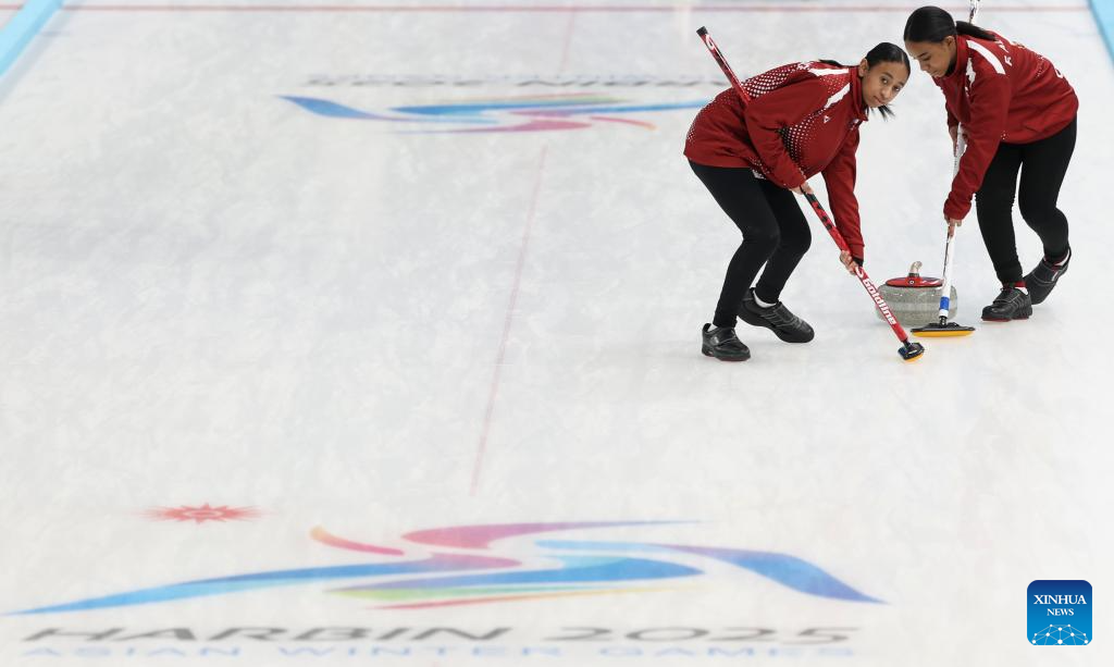 Fatima Ahmed Al-Fahad (R) and Aldana Ahmed Al-Fahad of Qatar compete during the curling women's round robin session 13 match between Qatar and China's Hong Kong at the 9th Asian Winter Games in Harbin, northeast China's Heilongjiang Province, Feb. 12, 2025. (Xinhua/Hu Xingyu)