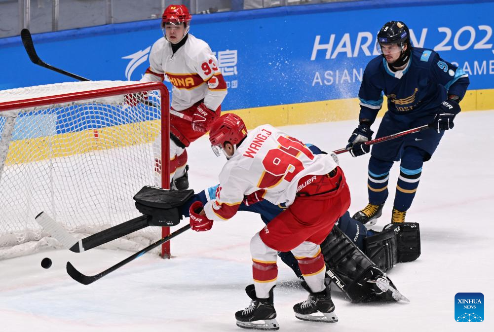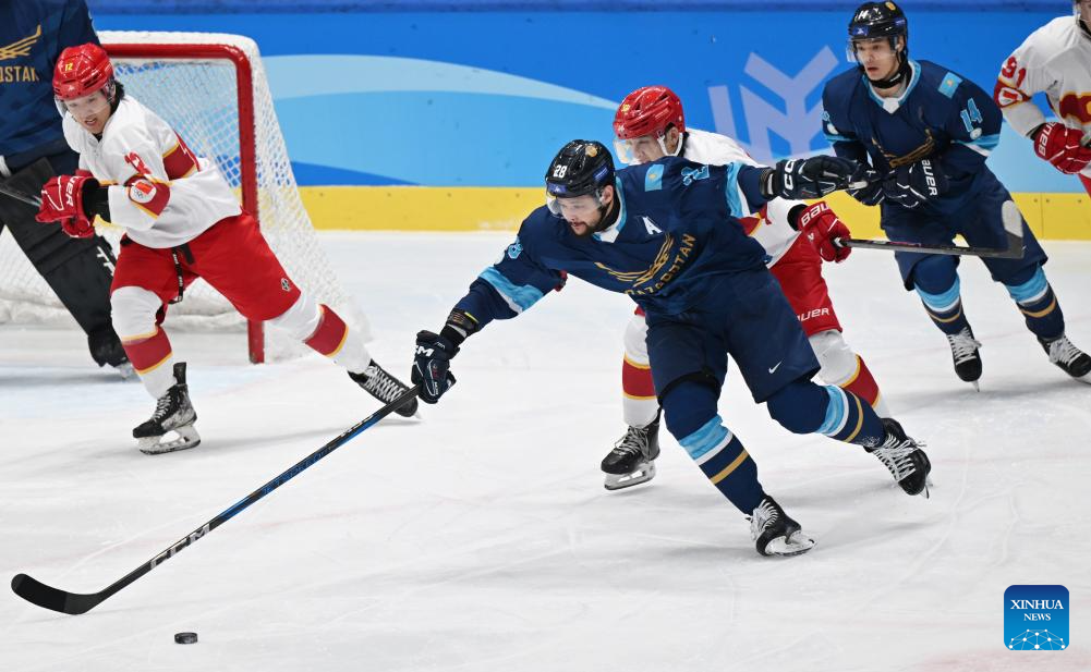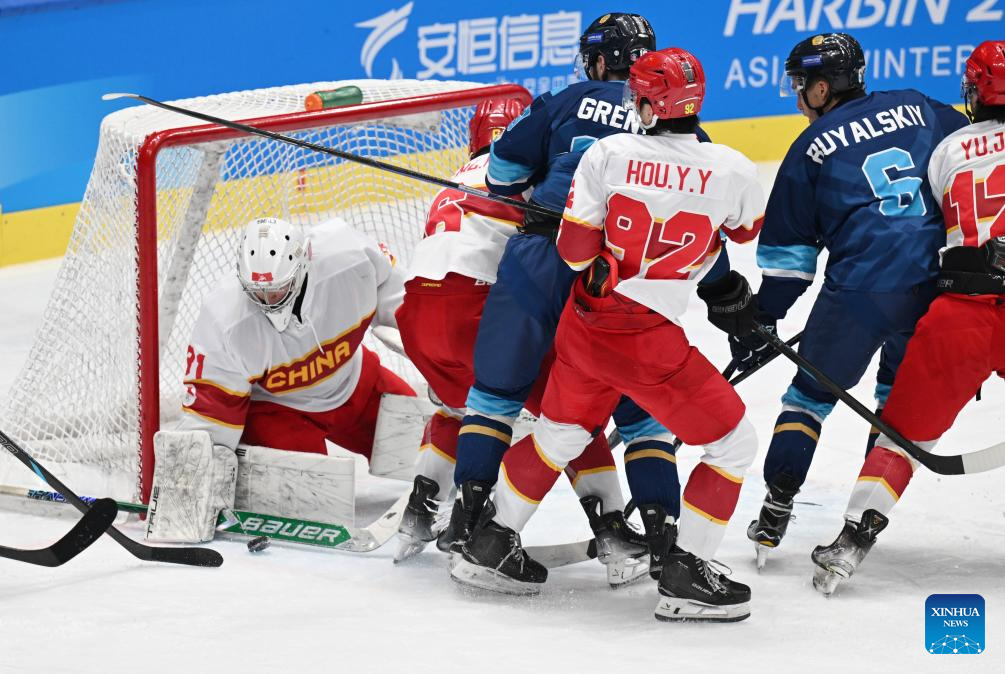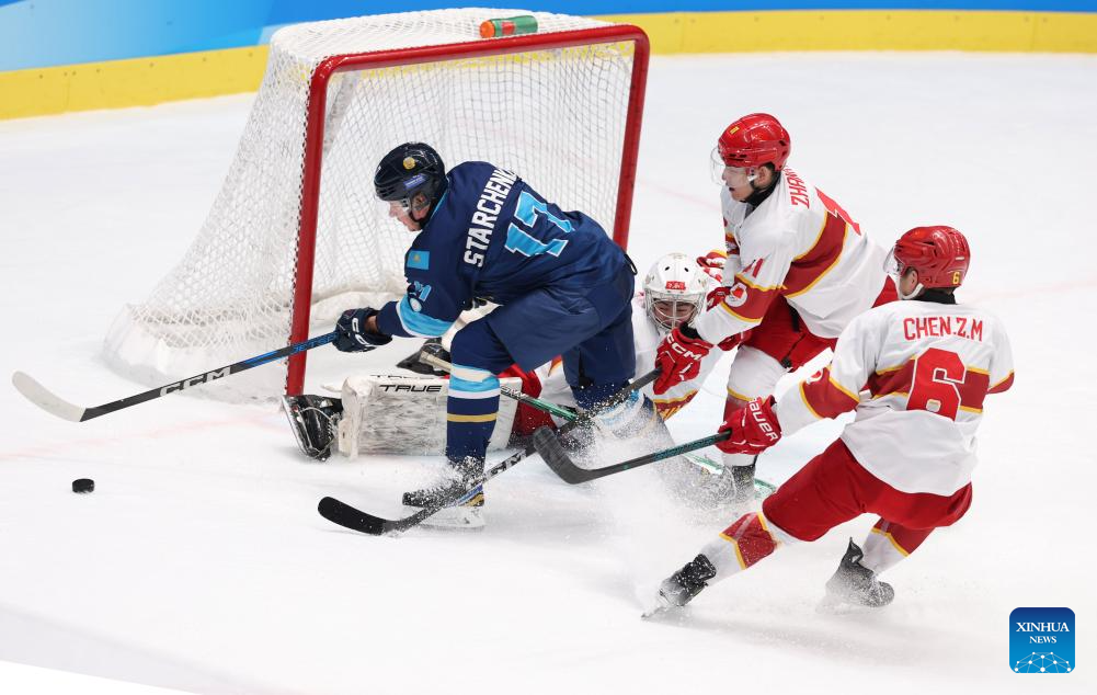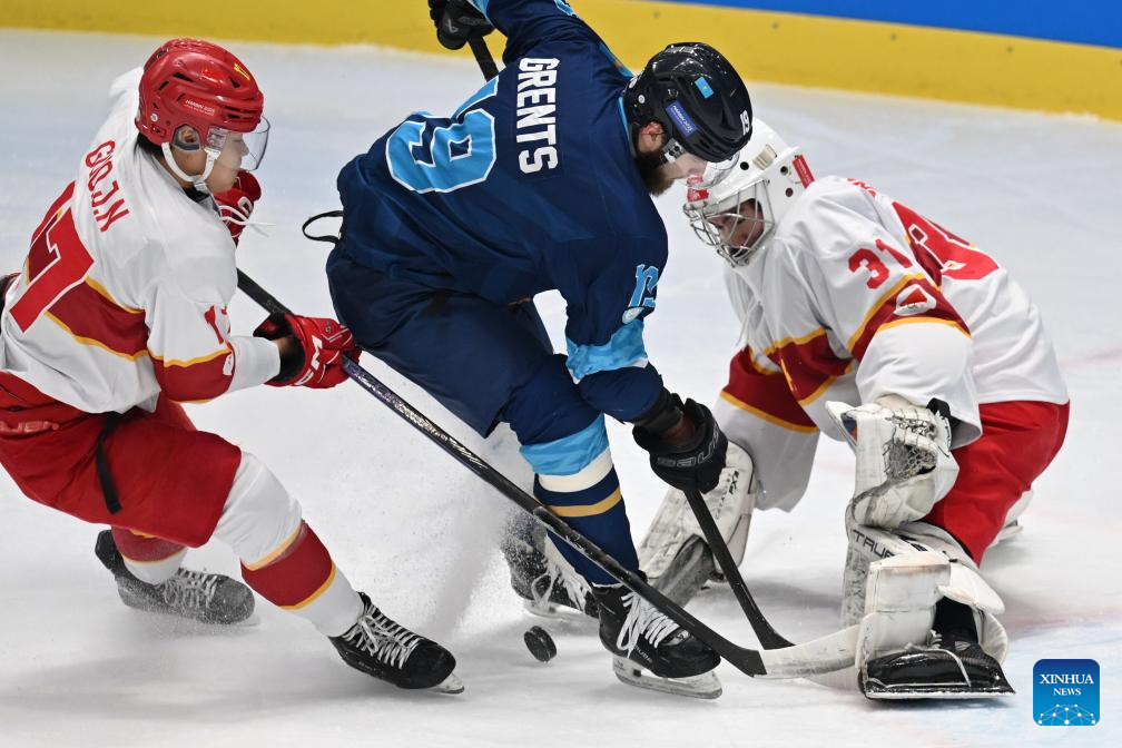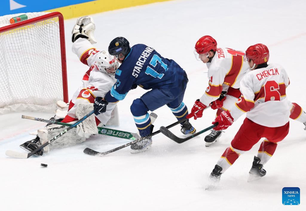 Roman Starchenko (2nd L) of Kazakhstan tries to shoot during the men's ice hockey play-offs semifinal match between Kazakhstan and China at 9th Asian Winter Games in Harbin, northeast China's Heilongjiang Province, on Feb. 13, 2025. (Xinhua/Yang Lei)