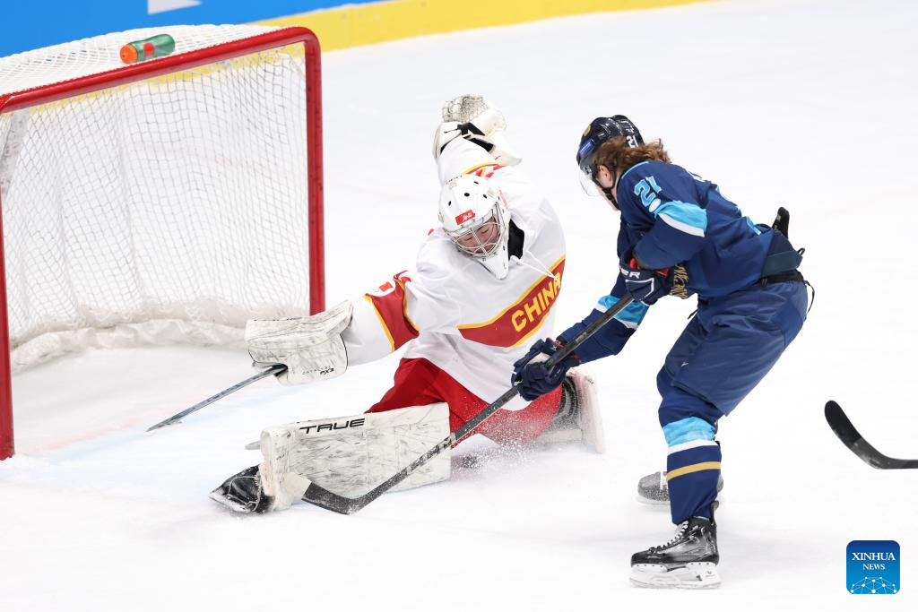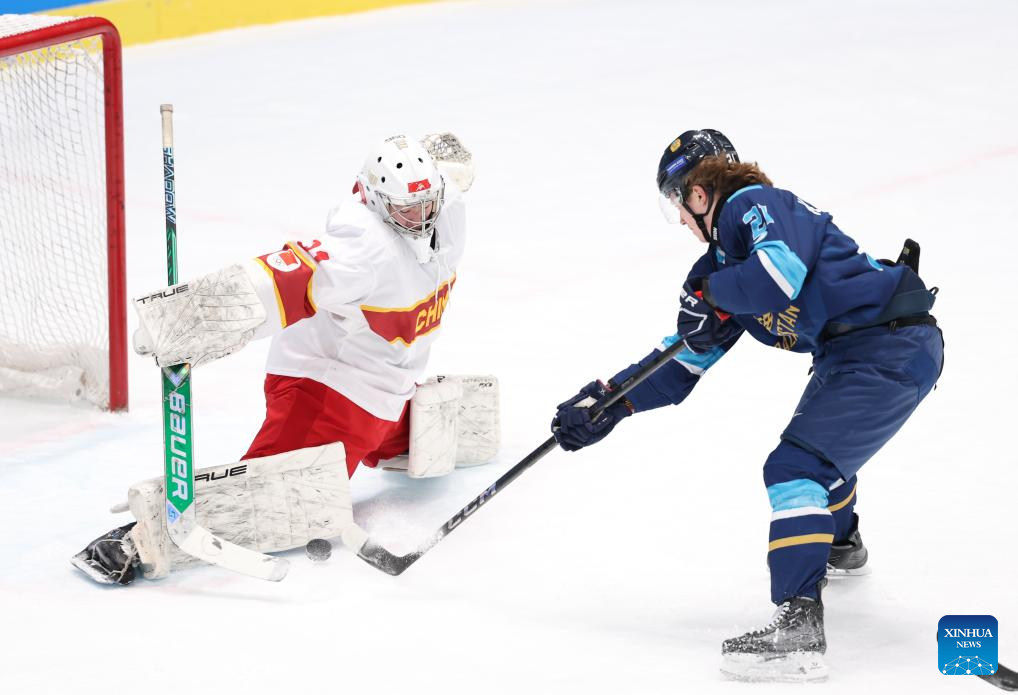 Chen Shifeng (L) of China tries to save a shoot from Roman Starchenko of Kazakhstan during the men's ice hockey play-offs semifinal match between Kazakhstan and China at 9th Asian Winter Games in Harbin, northeast China's Heilongjiang Province, on Feb. 13, 2025. (Xinhua/Cai Xiangxin)