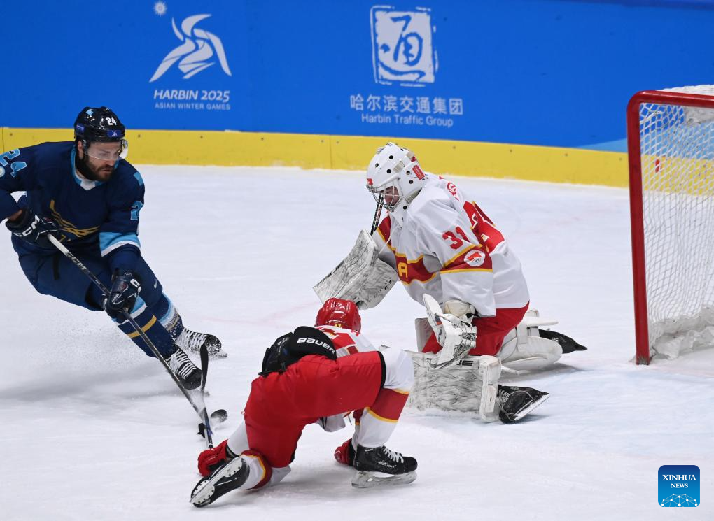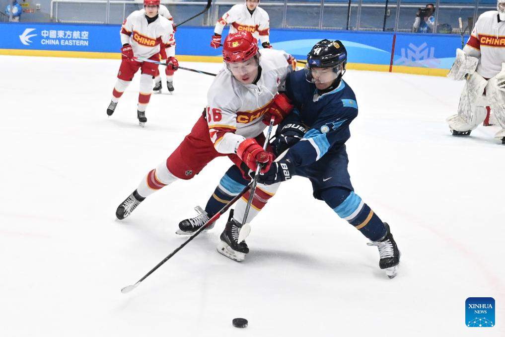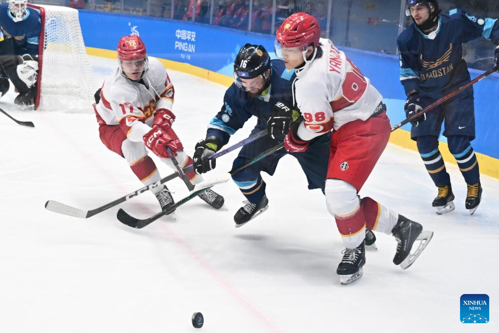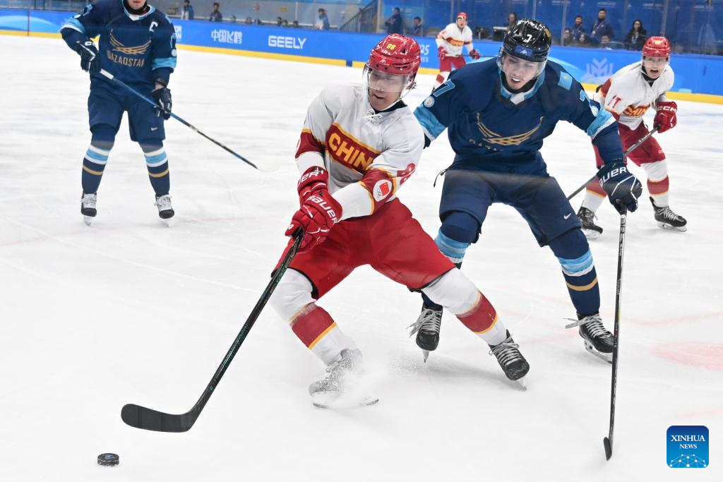Dmitriy Grents (C) of Kazakhstan competes during the men's ice hockey play-offs semifinal match between Kazakhstan and China at 9th Asian Winter Games in Harbin, northeast China's Heilongjiang Province, on Feb. 13, 2025. (Xinhua/Li Ziheng)