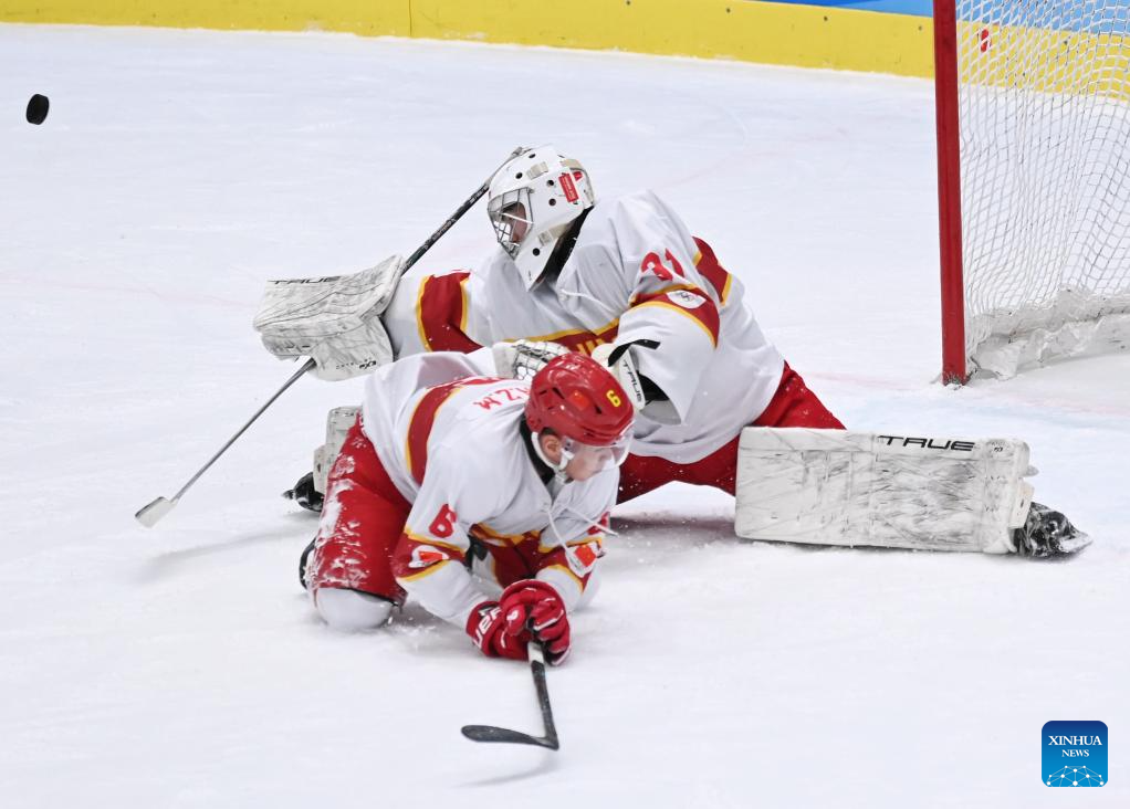 Chen Shifeng (R) of China saves a shoot during the men's ice hockey play-offs semifinal match between Kazakhstan and China at 9th Asian Winter Games in Harbin, northeast China's Heilongjiang Province, on Feb. 13, 2025. (Xinhua/Cai Xiangxin)