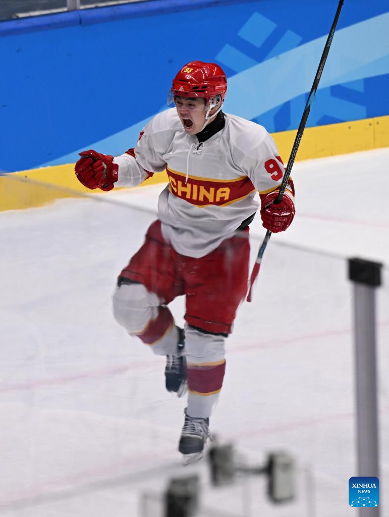 Wang Jing of China celebrates during the men's ice hockey play-offs semifinal match between Kazakhstan and China at 9th Asian Winter Games in Harbin, northeast China's Heilongjiang Province, on Feb. 13, 2025. (Xinhua/Li Ziheng)
