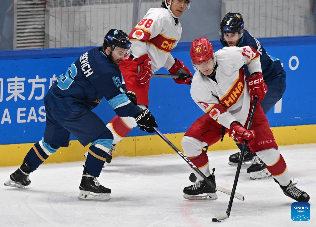 Alexandr Borissevich (C) of Kazakhstan vies with Guo Jianing (2nd L) and Yan Juncheng (2nd R) of China during the men's ice hockey play-offs semifinal match between Kazakhstan and China at 9th Asian Winter Games in Harbin, northeast China's Heilongjiang Province, on Feb. 13, 2025. (Xinhua/Li Jianan)