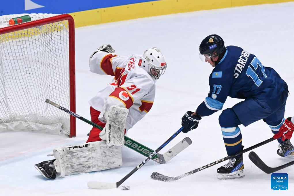 Vyacheslav Kolesnikov (R) of Kazakhstan shoots during the men's ice hockey play-offs semifinal match between Kazakhstan and China at 9th Asian Winter Games in Harbin, northeast China's Heilongjiang Province, on Feb. 13, 2025. (Xinhua/Yang Lei)