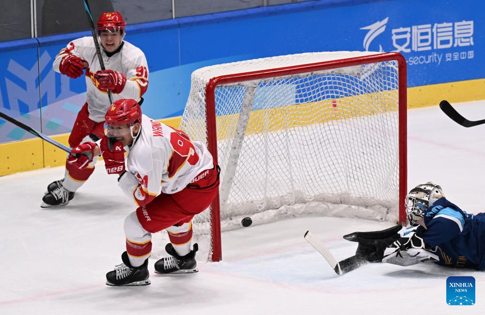 Wang Jing (2nd L) of China scores during the men's ice hockey play-offs semifinal match between Kazakhstan and China at 9th Asian Winter Games in Harbin, northeast China's Heilongjiang Province, on Feb. 13, 2025. (Xinhua/Li Ziheng)