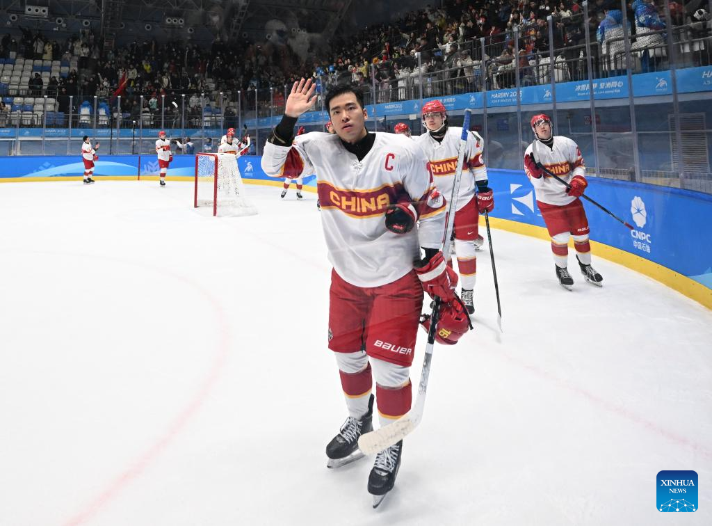Zhang Jiaqi (front) of China greets the spectators after the men's ice hockey play-offs semifinal match between Kazakhstan and China at 9th Asian Winter Games in Harbin, northeast China's Heilongjiang Province, on Feb. 13, 2025. (Xinhua/Li Jianan)