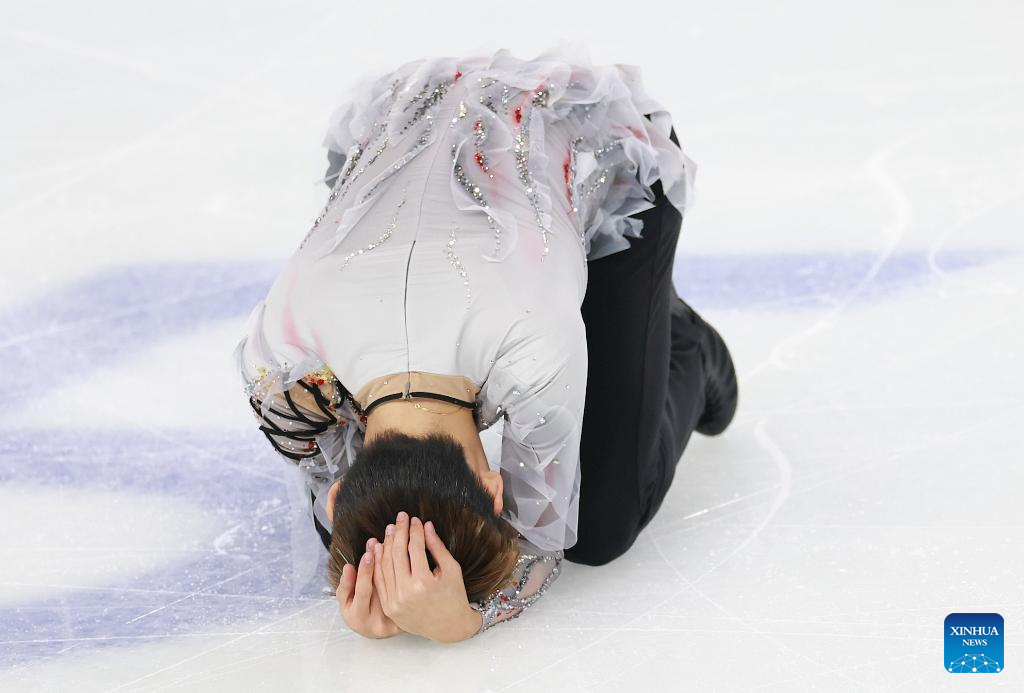 Chen Yudong of China reacts after the men single skating free skating of figure skating event at the 9th Asian Winter Games in Harbin, northeast China's Heilongjiang Province, Feb. 13, 2025. (Xinhua/Wang Xi)
