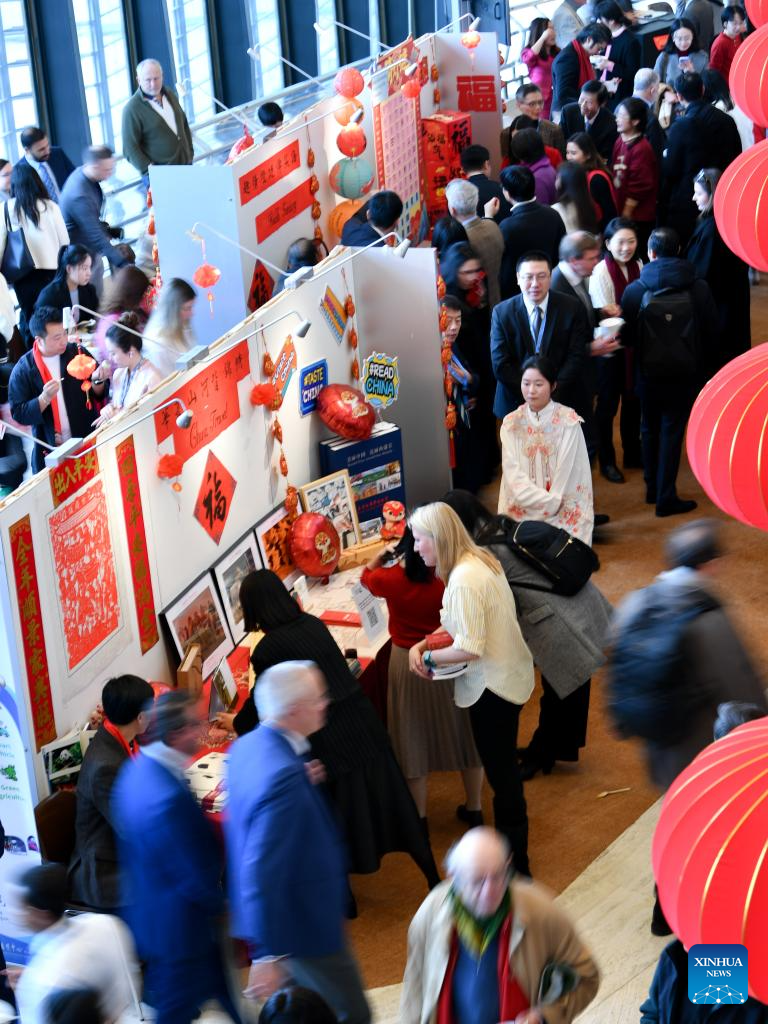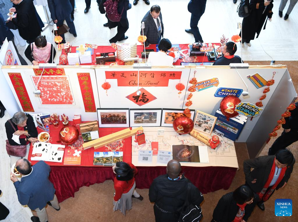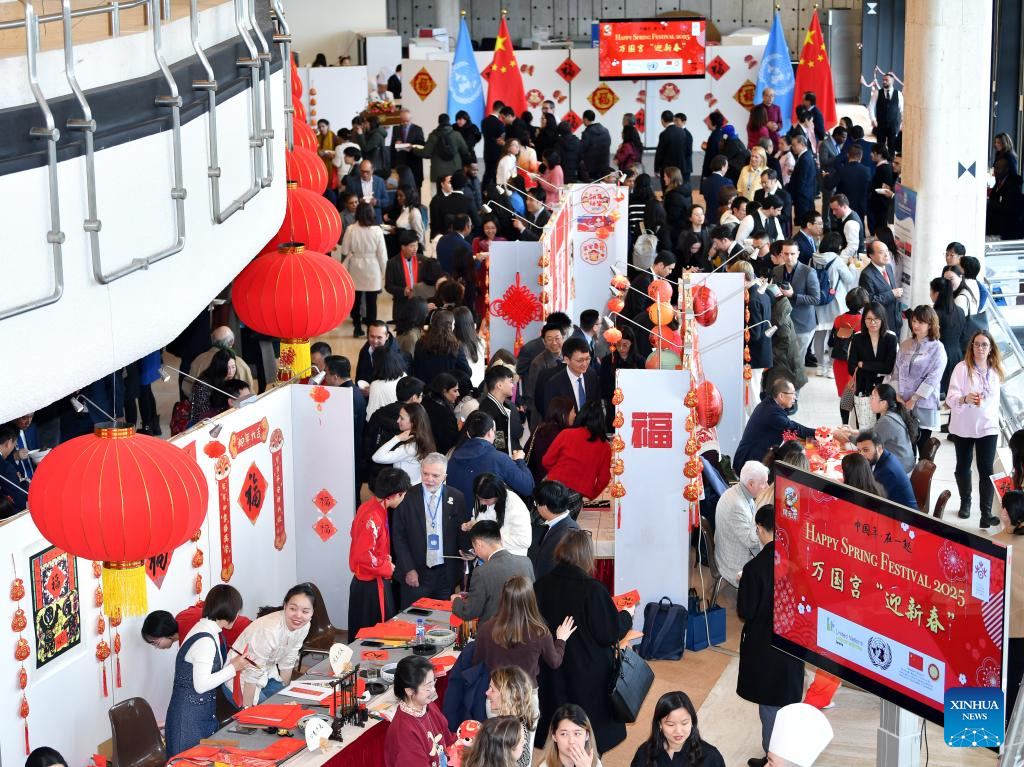 People participate in an event celebrating the Chinese Spring Festival at the Palais des Nations in Geneva, Switzerland, Feb. 12, 2025. This event featuring Tai Chi fan performances, paper-cutting, calligraphy, and lantern riddles was held here on Wednesday. It was organized by the Permanent Mission of China to the UN Office in Geneva and other international organizations in Switzerland. (Xinhua/Lian Yi)