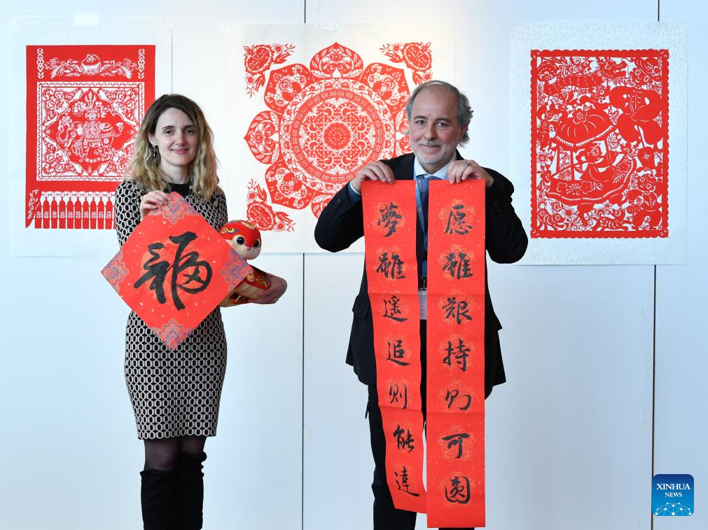 UN staff members Rita Franceschet (L) and Abdel Wahab Hani pose for a photo with Chinese calligraphy works during an event celebrating the Chinese Spring Festival at the Palais des Nations in Geneva, Switzerland, Feb. 12, 2025. This event featuring Tai Chi fan performances, paper-cutting, calligraphy, and lantern riddles was held here on Wednesday. It was organized by the Permanent Mission of China to the UN Office in Geneva and other international organizations in Switzerland. (Xinhua/Lian Yi)