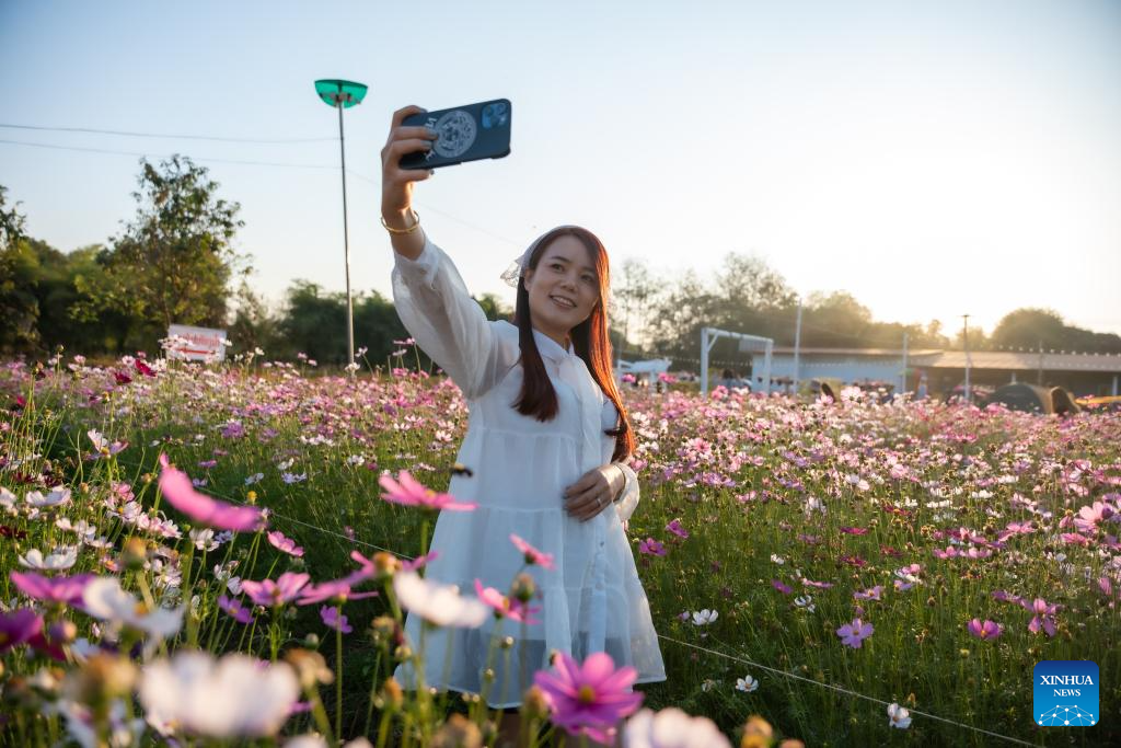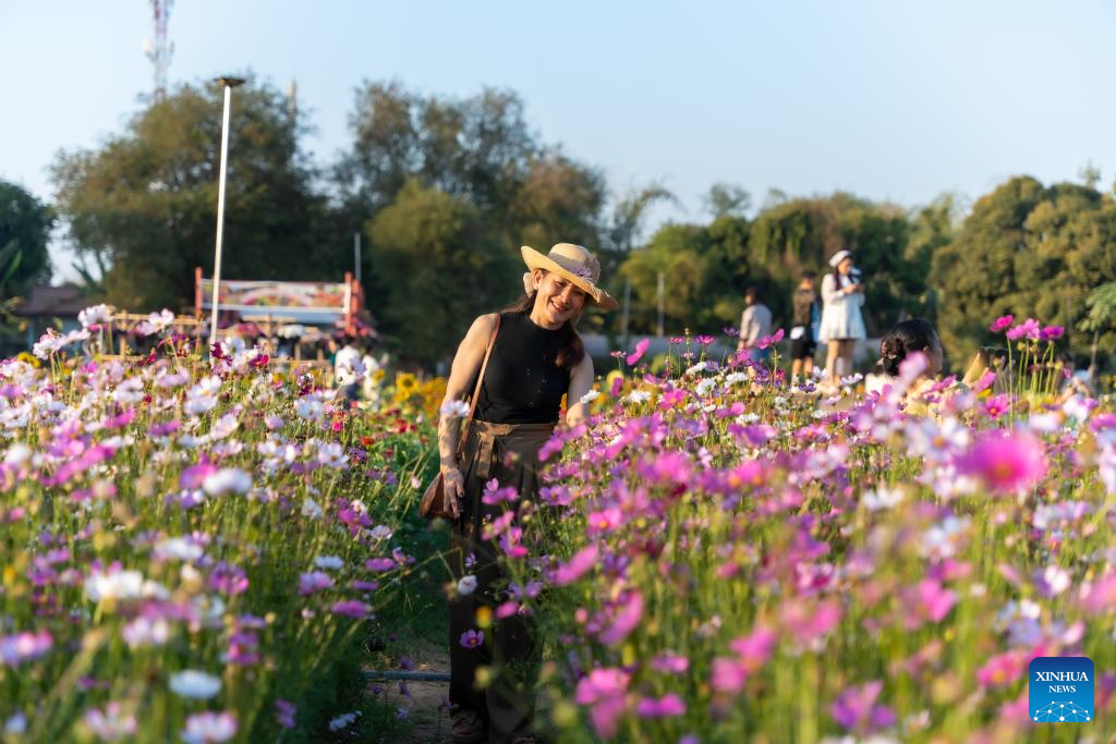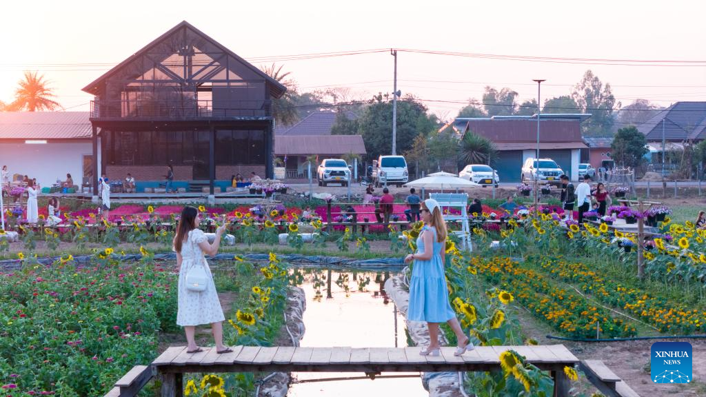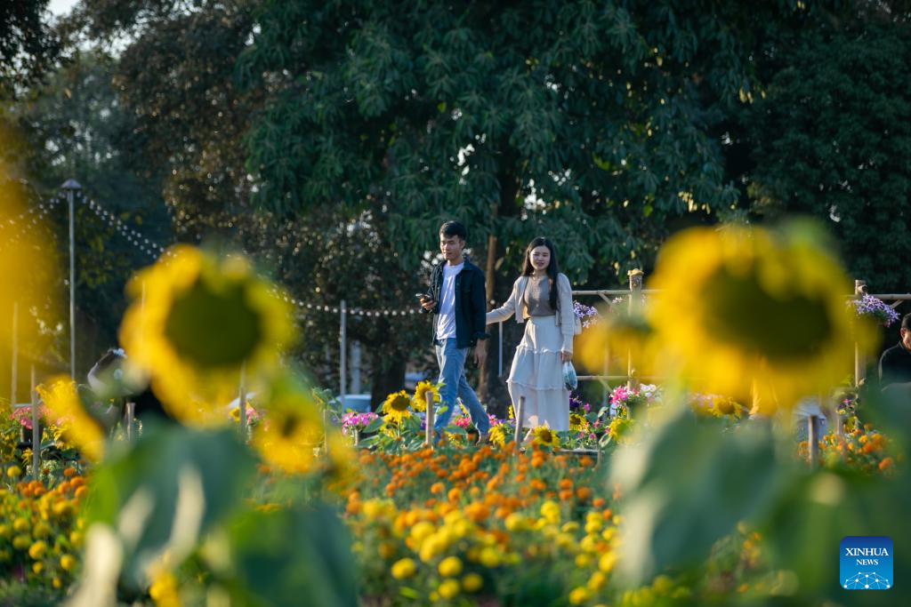 People enjoy blooming flowers at a park in Vientiane, Laos, Feb. 12, 2025. (Photo by Kaikeo Saiyasane/Xinhua)