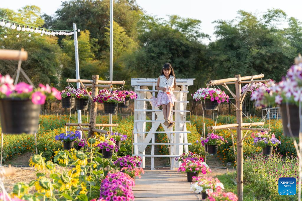 A girl enjoys blooming flowers at a park in Vientiane, Laos, Feb. 12, 2025. (Photo by Kaikeo Saiyasane/Xinhua)
