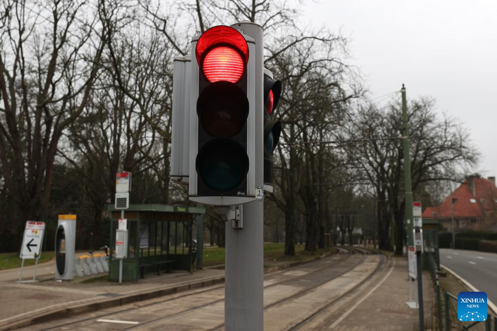 An empty tram station is seen in Brussels, Belgium, Feb. 13, 2025. Tens of thousands of people marched through central Brussels, Belgium, on Thursday to protest against planned government reforms, as unions warned of further strike action unless policymakers reconsider their proposals.