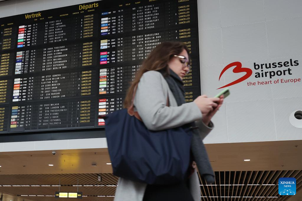 A flight information board is seen at the departure hall of Brussels Airport in Zaventem, Belgium, Feb. 13, 2025. Tens of thousands of people marched through central Brussels, Belgium, on Thursday to protest against planned government reforms, as unions warned of further strike action unless policymakers reconsider their proposals.