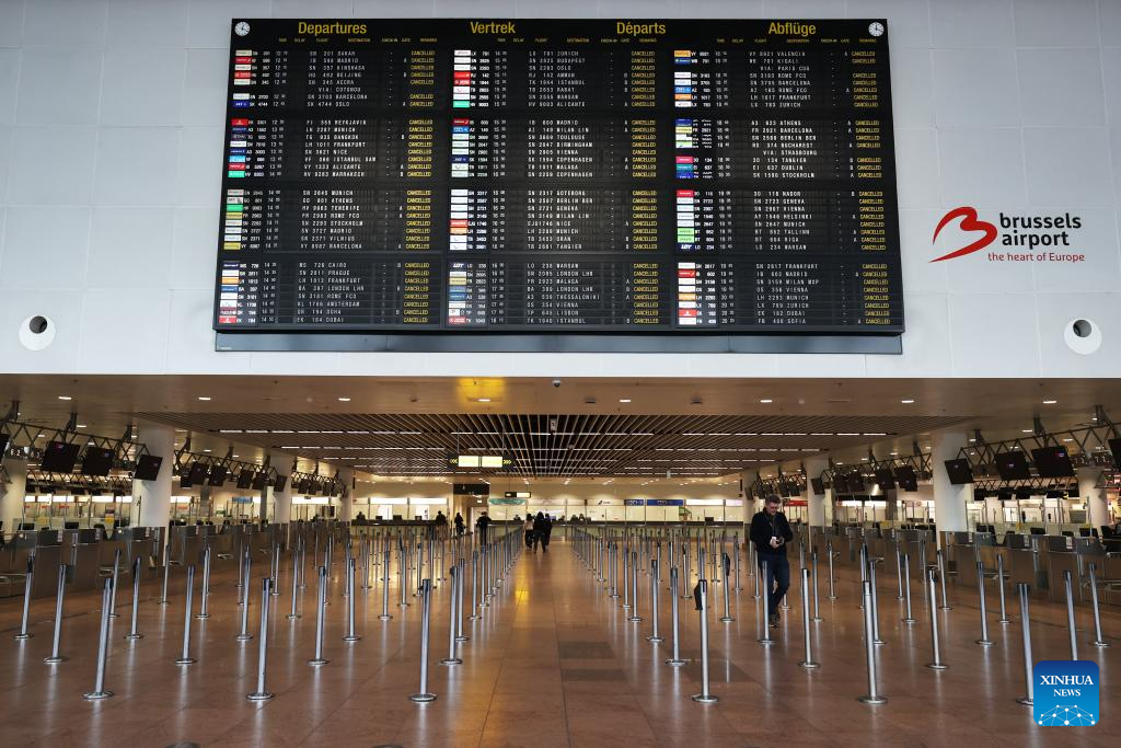 The empty departure hall of Brussels Airport is seen in Zaventem, Belgium, Feb. 13, 2025. Tens of thousands of people marched through central Brussels, Belgium, on Thursday to protest against planned government reforms, as unions warned of further strike action unless policymakers reconsider their proposals. The demonstration brought parts of the capital to a standstill, halting traffic on key routes and disrupting public transport. Brussels Airport canceled 430 flights as ground operations were suspended, while metro, bus, and tram services were severely affected.(Xinhua/Zhao Dingzhe)