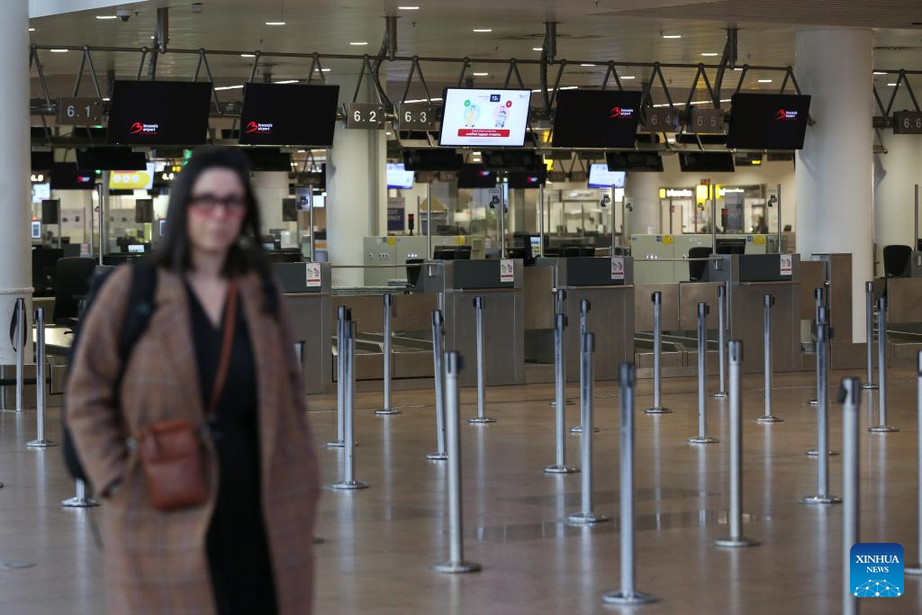 Empty waiting lines are seen at the departure hall of Brussels Airport in Zaventem, Belgium, Feb. 13, 2025. Tens of thousands of people marched through central Brussels, Belgium, on Thursday to protest against planned government reforms, as unions warned of further strike action unless policymakers reconsider their proposals.