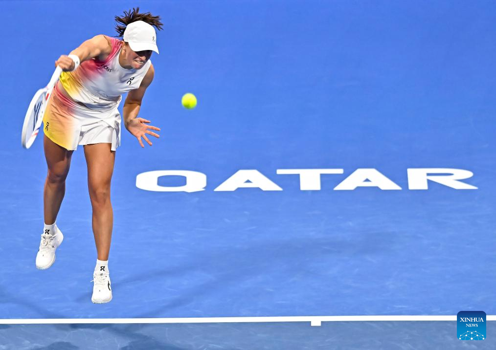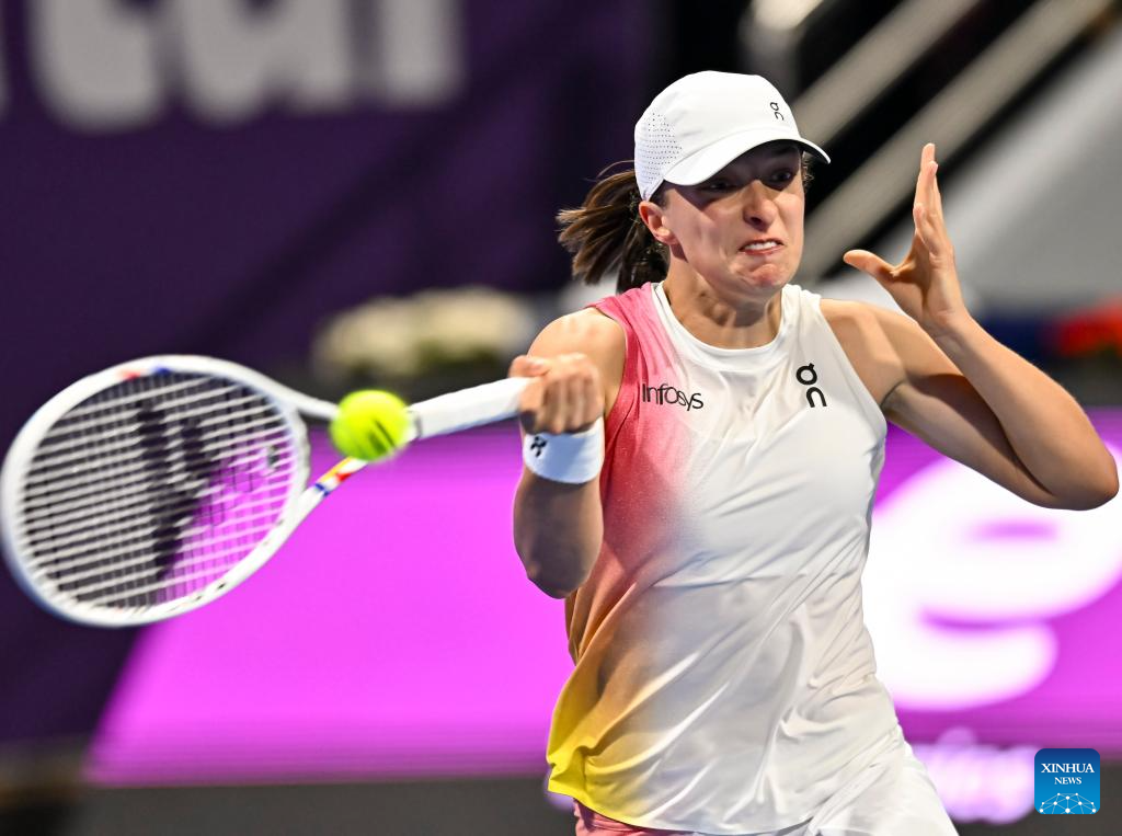Iga Swiatek of Poland hits a return during women's singles round of 16 match between Iga Swiatek of Poland and Linda Noskova of the Czech Republic at the WTA Qatar Open tennis tournament in Doha, Qatar, Feb. 12, 2025. (Photo by Nikku/Xinhua)
