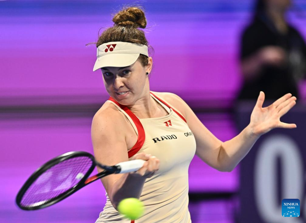 Linda Noskova of the Czech Republic hits a return during women's singles round of 16 match between Iga Swiatek of Poland and Linda Noskova of the Czech Republic at the WTA Qatar Open tennis tournament in Doha, Qatar, Feb. 12, 2025. (Photo by Nikku/Xinhua)