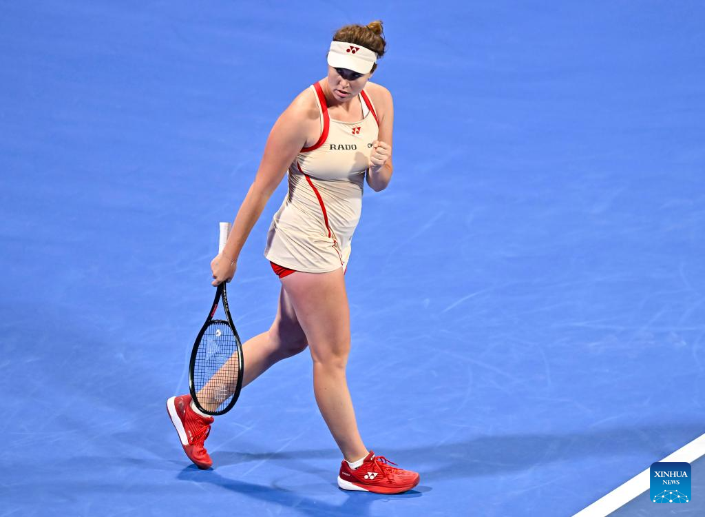 Linda Noskova of the Czech Republic celebrates during women's singles round of 16 match between Iga Swiatek of Poland and Linda Noskova of the Czech Republic at the WTA Qatar Open tennis tournament in Doha, Qatar, Feb. 12, 2025. (Photo by Nikku/Xinhua)